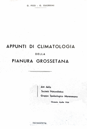 SPELEOLOGIA E NATURALISMO IN MAREMMA. Articoli: 2. La grotta di Roselle o del Danese. 3. Escursione alla "Gessarona". 4. "Andiamo per grotte". 5. Un orso della caverne nella grotta del Chiostraccio. 6. Cala di Forno. 7. Bocca d'Ombrone. 8. I giorni del diluvio 9. Gita all'Argentario. 10. Sulla necessità di costituire un parco nazionale dell'Uccellina. 11. Speleologia e preistoria in provincia di Grosseto. 12. Coleotteri della provincia di Grosseto. 13. Primo catalogo di mammiferi non domestici presenti o segnalati in Matremma. 14. Prime note sull'età e sull'origine della pianura grossetana. Stampato nel 1967 a cura di G. Guerrini. SCARICABILE IN .PDF (11,4 Mb) --------------------------------------------------- 1. Sullo stato del verde nella fascia costiera maremmana. 2. Elenco aggiornato dei campeggi nella facia costiera della provincia di Grosseto. 3. La pineta di Principina a Mare. 4. La pineta. 5. Sul rimboschimento dell'Argentario dopo gli sperperi dovuti agli incendi dell'80. 6. Evoluzione del diritto di proprietà - riflessioni. 7. Beni naturali e turismo. 8. L'attuazione delle previsioni della variante al P.R.G. di Grosseto. 9. La questione della Fiumara di Grosseto. Stampato nel 1982 a cura di G. Guerrini. SCARICABILE IN .PDF (5,88 Mb.) --------------------------------------------------- 1. Urbanistica e turismo. 2. La legislazione protezionistica. 3. Per un nuovo genere di ferie. 4. Arredo urbano - Scelte da rivedere. 5. Ambiente, campeggi, turismo sociale. 6. Il Parco, Rispescia e ... dintorni. 7. Il pasticciaccio del "nucleare". 8. Turismo montano e rispetto dell'ambiente. 9. Le associazioni naturalistiche o protezionistiche della provincia di Grosseto. Stampato nel 1983 a cura di G. Guerrini. SCARICABILE IN .PDF (4,26 Mb.) --------------------------------------------------- IL VERDE, IL CAVALLO E ALTRO. Articoli: 1. In margine a tre recenti convegni. 2. Dagli enunciati ai fatti. 3. Ancora un attacco massiccio ai boschi maremmani. 4. "Questione Rispescia". 5. Legge regionale n. 52 e Decreto Galasso. 6. Nel grossetano, il "verde" pare soltanto un colore. 7. Caccia e gelo. 8. Il territorio. Alcune considerazione e proposte. 9. L'amico cavallo, visto dal naturalista. 10. Sull'abbattimento di eucalipti al Parco. 11. Un porto anche a Cosa? Stampato nel 1985 a cura di G. Guerrini. SCARICABILE IN .PDF (4,32 Mb.) --------------------------------------------------- Atti S.N.S.M. 1964 - Fissi A., Guerrini G. SCARICABILE IN .PDF 2,3 Kb